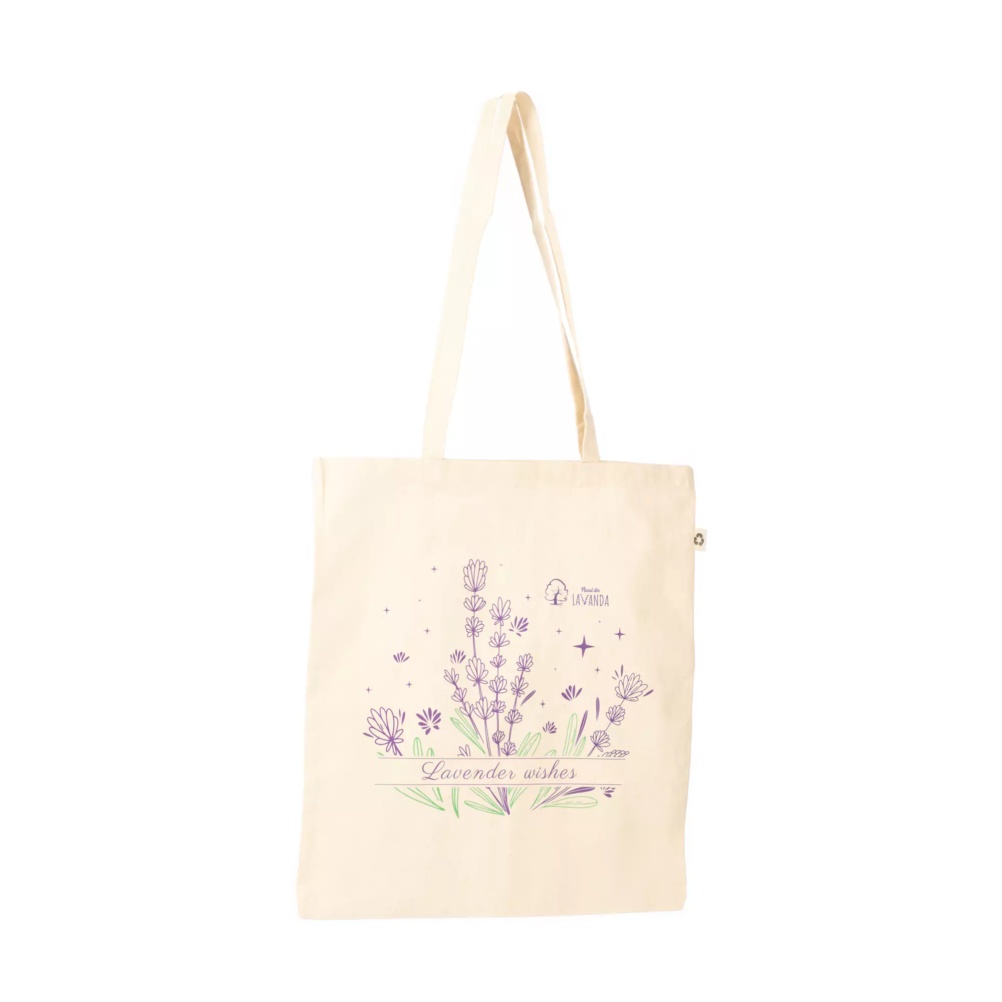 Sacoșa ecologică Nucul din lavandă din bumbac 100% (65% reciclat) cu model trendy cu flori de lavandă te va face să iți dorești să te întorci în natură, să ai grijă de ea și să te simți relaxat.  Cu mânerele lungi, o poți lua la școală, la cumpărături sau la o întâlnire cu prietenii. Ușoară și de folos ori de câte ori ai nevoie, poart-o ca atare sau fă-o cadou.  De câte ori te vom zări cu ea ne vom simți onorați și recunoscători.   Dimensiuni: 38x42cm Material: bumbac ( 65% reciclat, 35% convențional)