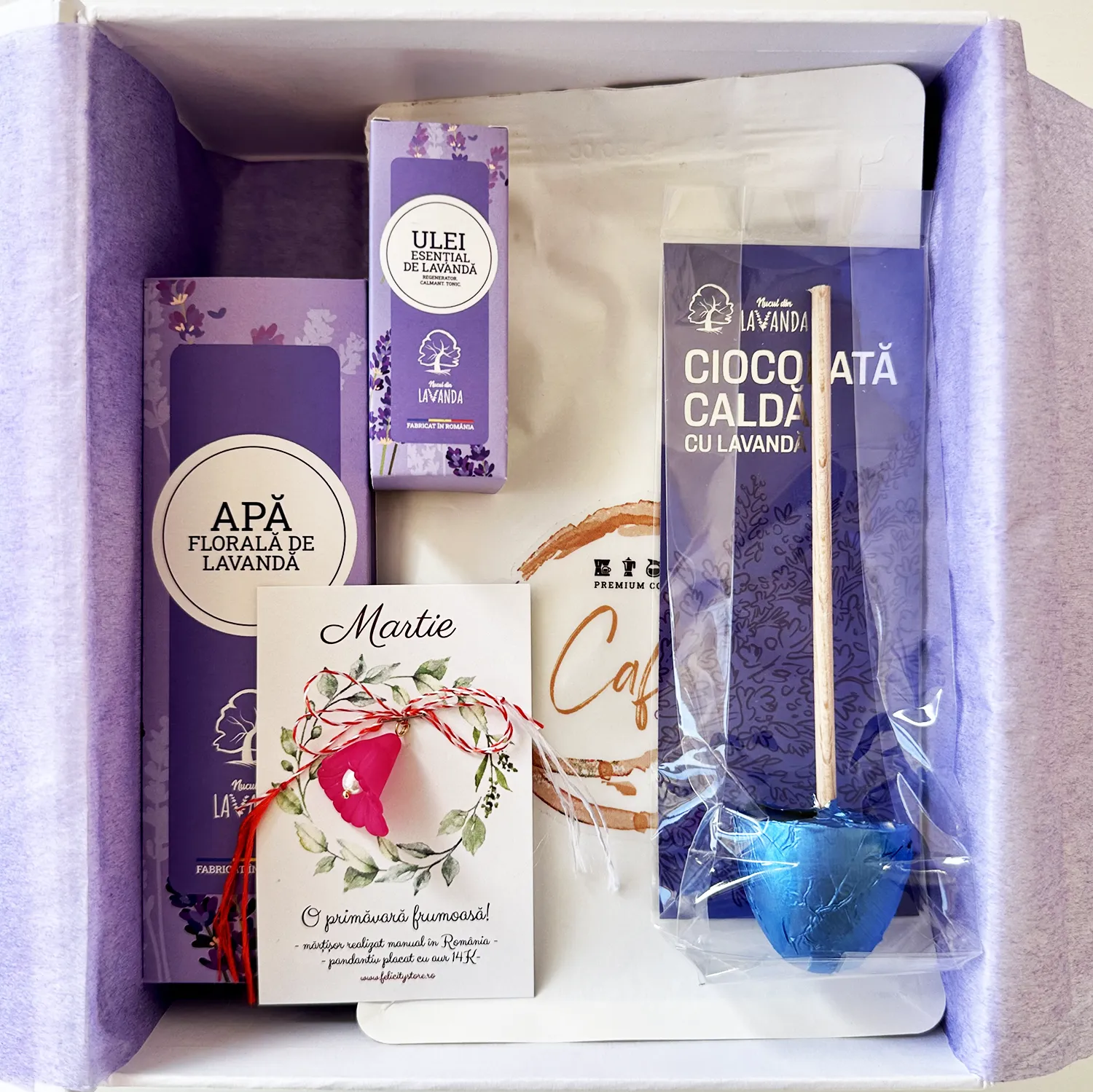 Acest cadou îl poți tine pentru tine sau îl poți împărți cu cei dragi. Poți folosi uleiul esențial pentru a crea o atmosfera relaxata in încăpere, iar cafeaua sau ciocolata calda pentru un prilej de conexiune cu cine ti-e drag. Mărțișorul delicat, placat cu aur de 14k, iti va aminti cat esti de speciala si ca te poti bucura de aceasta primavara si de un nou inceput.   Pachetul conține :