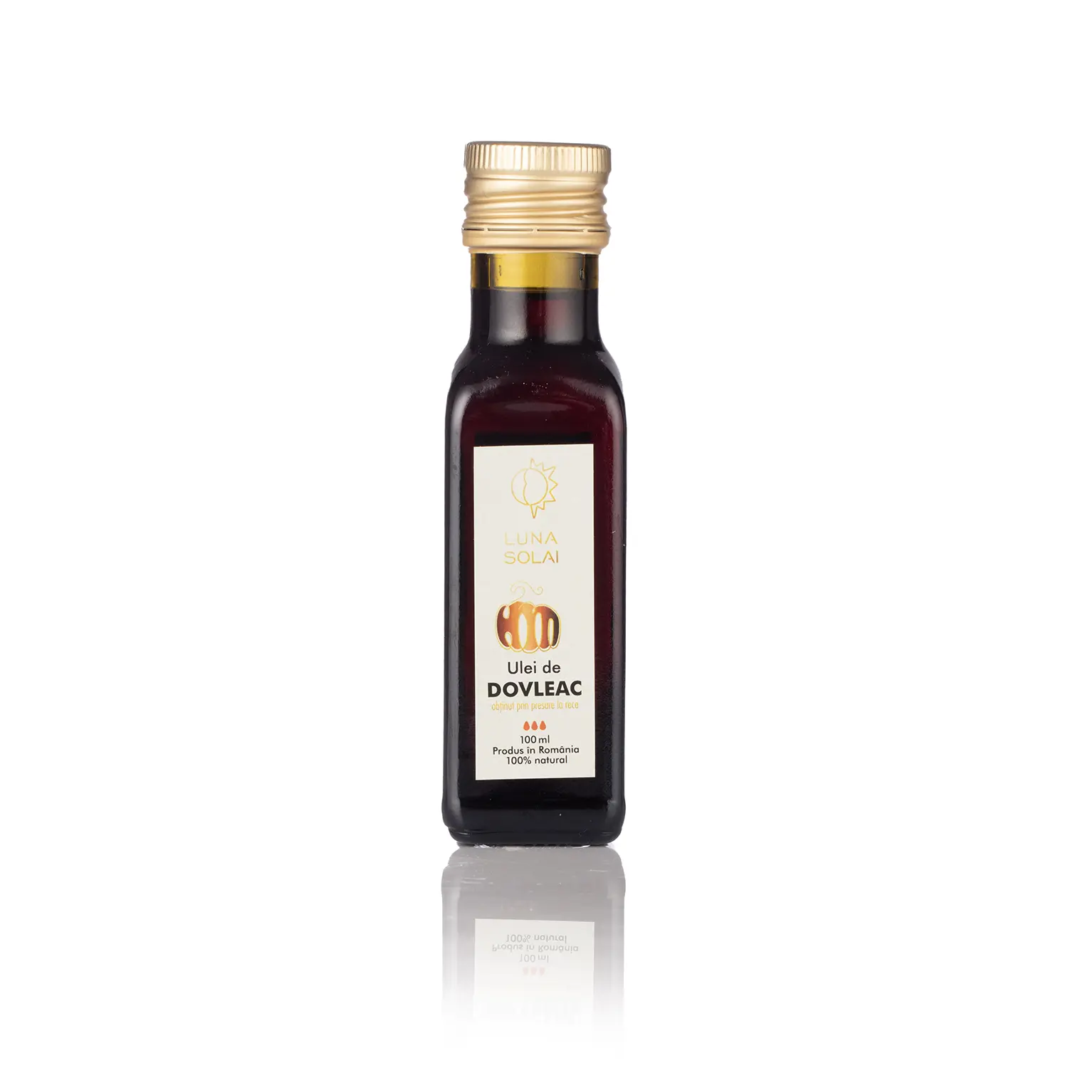 Uleiul de dovleac este dicromatic ceea ce înseamnă că are două culori în același timp: roșu (rubin) și verde. Culoarea verde este dată de clorofilă, în timp ce culoarea roșie este dată de caroten, ambele conținute în semințe. Uleiul obținut din semințe crude de dovleac este bogat în substanțe nutritive, are un gust plăcut de semințe crude de dovleac, vâscozitate și o aromă aparte. Uleiul de dovleac conține, de asemenea, vitaminele A (beta-caroten), vitamina E, B1, B2, vitamina C, și niacină. Este bogat în Omega 3, 6 si 9, grăsimi sănătoase, și foarte sărac în grăsimi saturate. Acesta are un conținut ridicat de fier, fluor, iod, potasiu, calciu, cupru, magneziu, mangan, sodiu, fosfor, seleniu, sulf, zinc, fiind recunoscut pentru beneficiile terapeutice pe care le are. Cantitate netă : 100 ml. Ingrediente: Ulei de dovleac presat la rece. Valabilitate : până la 45 zile după deschidere Ambalare: sticlă 100 ml