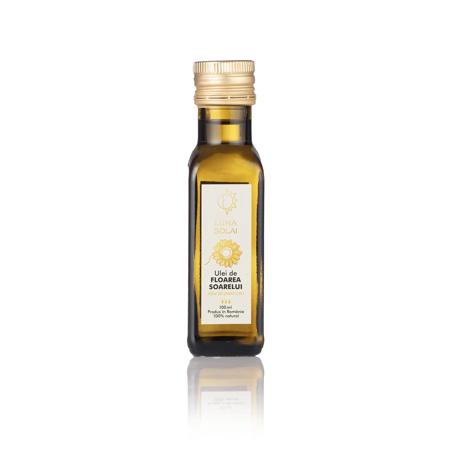 Uleiul de floarea soarelui presat la rece are o culoare galben aurie, are un gust plăcut, vâscozitate și aromă aparte, specifică semințelor de floarea soarelui. Are un conținut mare de lecitină, ce ajută la tonifierea sistemului nervos, conține vitaminele A, E si D, acizi grași polinesaturați , activi în scăderea colesterolului, precum și substanțe cu efecte antiinfecțioase, regenerative și stimulatoare ale activității hormonale. Consumul de uleiuri presate la rece în locul celor rafinate, contribuie la profilaxia îmbătrânirii precoce, scăderea colesterolului, a hipertensiunii arteriale, a riscului de accident vascular, dar și la eliminarea problemelor gastrice. Cantitate netă : 100 ml. Ingrediente: Ulei de floarea soarelui presat la rece. Valabilitate : până la 60 zile după deschidere Ambalare: sticlă 100 ml